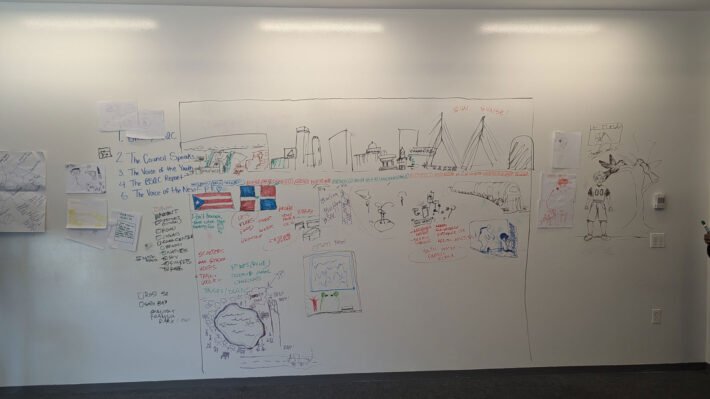 This summer my studio partner and I were invited by a former classmate, now teacher at Boston Student Advisor Council, to do a mural project with her students as a capstone project for their summer session. The mural was designed in collaboration with the students and the owner of the building to depict Boston from a youth perspective in on a wall in the heart of historic Nubian Square. The project was completed over the course of a month from first ideation session to completed wall. This was an incredibly rewarding experience for me and Franco who have grown up inspired by the ‘Faces of Dudley’ Mural and recently have enjoyed an influx of amazing public art in the area, much of it by our friends and mentors. It is an honor to be able to contribute to this legacy and to do so alongside such an inspiring and powerful group of young folks. Their fresh ideas, love for their community and commitment to justice give me hope and shine through their work. It was also an amazing expereince to spend a couple weeks working with our neighbors ‘down Dudley’. We made many new friends and were reminded daily of how much our work was appreciated and how much it meant to the neighborhood to have some new color on the corner.