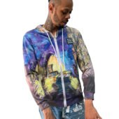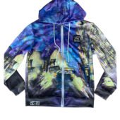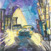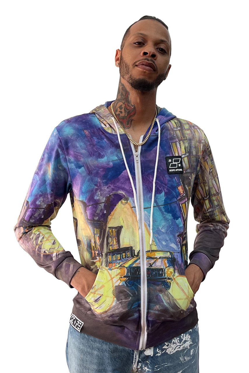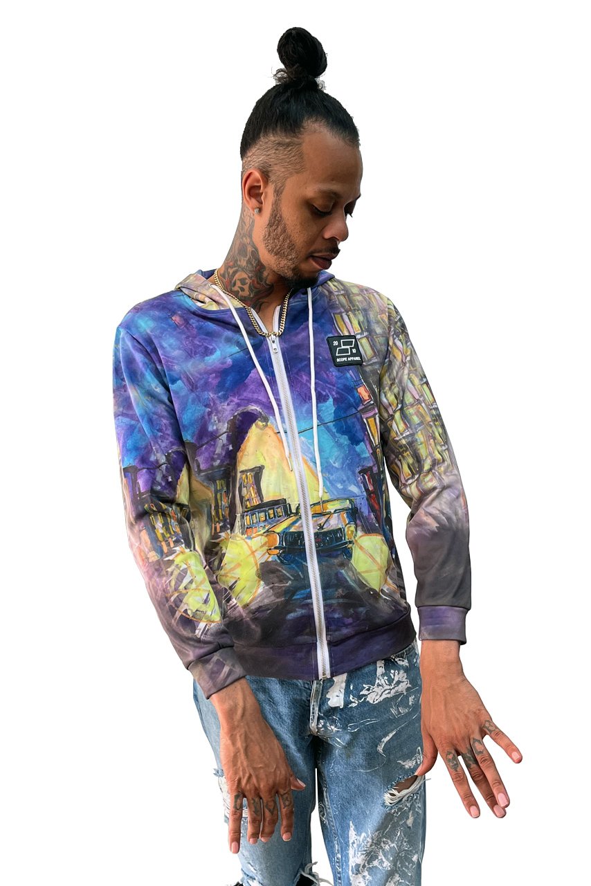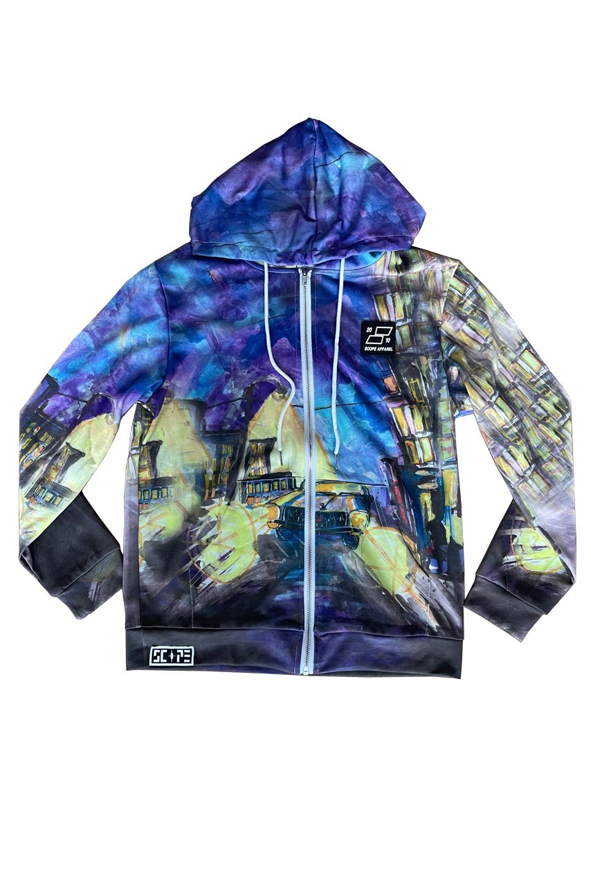 In some ways this piece was inspired by his love for art deco, in the way the lights from the cars and street lamps become geometric shapes and the overall palette. I did it for him. When I got the original piece back I scanned it and we produced a very limited experimental run of all over print Scope hoodies with this design as well as some stickers to go with it.