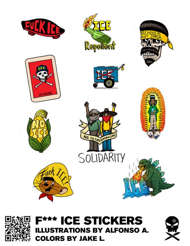 When ICE began it’s systematic rollout in our cities, targeting our communities and families, like so many I felt outraged and also a bit helpless. In a moment of despair I forgot our collective strength in the face of such hate. I thank my comrades Agustin and Alphonso for coming through with the reminder that we have each other and we are many, coast to coast in all trades. While we all have a responsibility to show up for each other, we also need to show up for ourselves and nourish those things that give us strength. For me that is art and especially collaboration. Alphonso is an incredible illustrator whose work brings that LA, Graffiti, Tattoo inspiration. I had the pleasure of adding color to these images. Shoutout to Agustin for making the connection and taking the work to the streets.