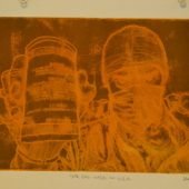 This was a print I made in early 2011 during the beginning of the Egyptian Revolution and Arab Spring. This is a monotype based off of a news photo of a man holding up a can of American made tear gas in a protest. I was drawn to this image because it shows how US Military Aid and weapons make their way into conflicts across the globe, even (especially) ones that fail to capture national attention.