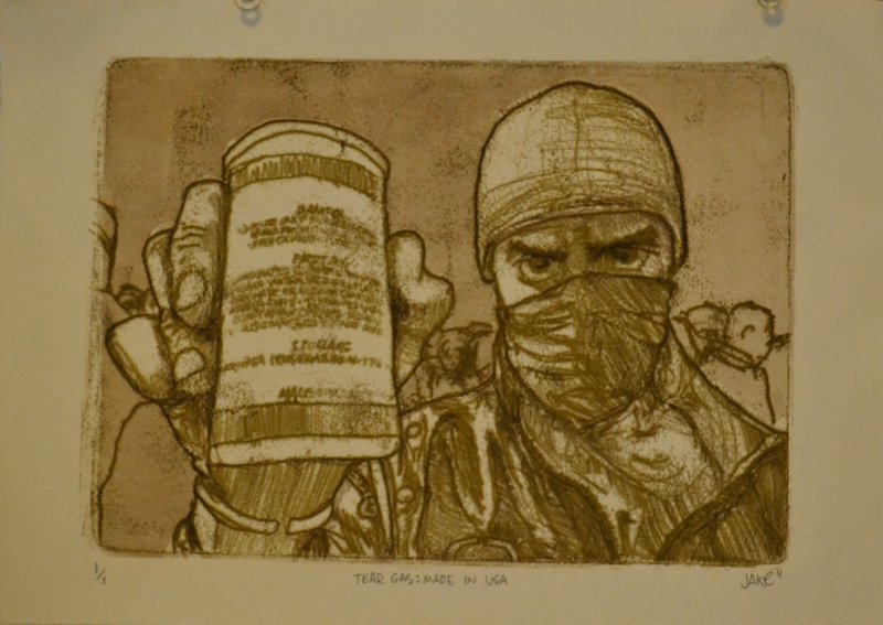 This was a print I made in early 2011 during the beginning of the Egyptian Revolution and Arab Spring. This is a monotype based off of a news photo of a man holding up a can of American made tear gas in a protest. I was drawn to this image because it shows how US Military Aid and weapons make their way into conflicts across the globe, even (especially) ones that fail to capture national attention.