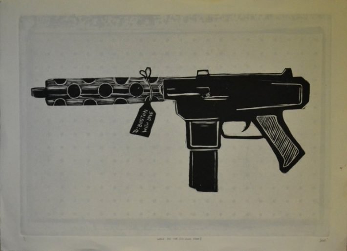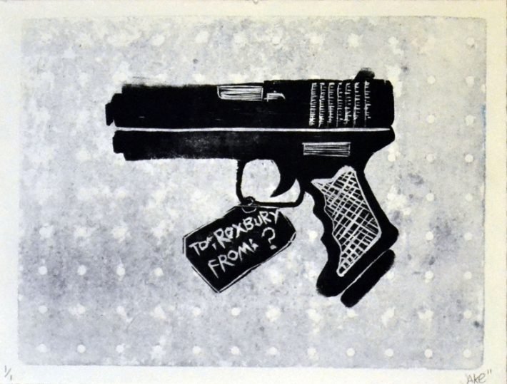“Where Did the Gun Come From?” is a sereis of monotype woodcuts I made inspired by the work of Citizens for Safety to ask about the source of guns and how they get into our communities where they are used in violent crimes, often by young people or people with criminal records and can not legally own guns.