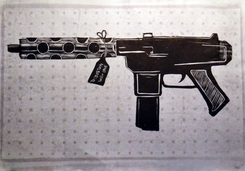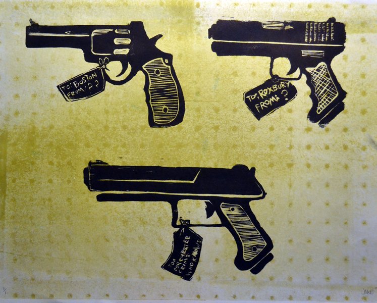 “Where Did the Gun Come From?” is a sereis of monotype woodcuts I made inspired by the work of Citizens for Safety to ask about the source of guns and how they get into our communities where they are used in violent crimes, often by young people or people with criminal records and can not legally own guns.